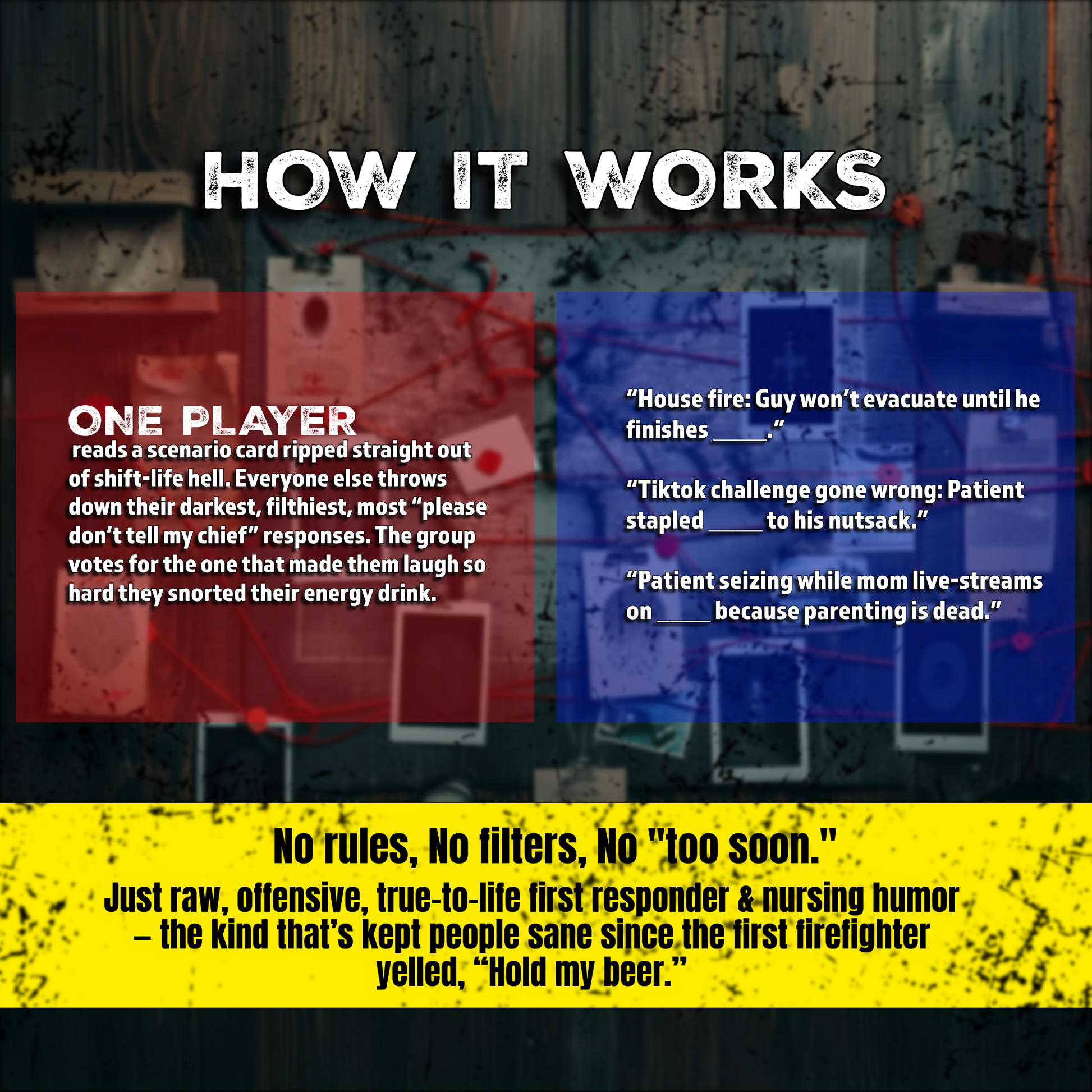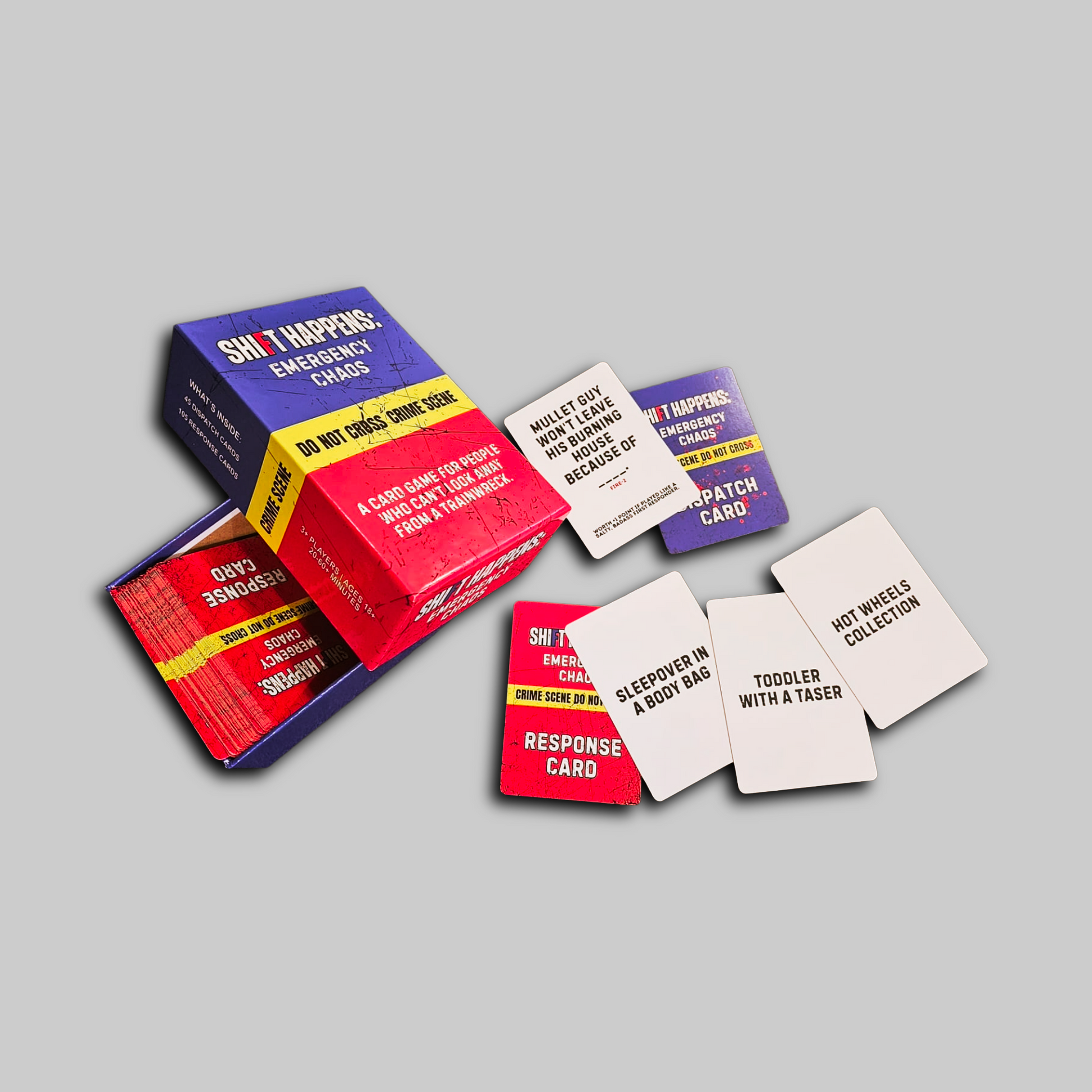 Welcome to the chaos. You’re not here to save lives — you’re here to laugh at the absolute dumpster fire of humanity. Shift Happens: Emergency Chaos is an R-rated, dark-humor party card game built for first responders, nurses, and anyone twisted enough to enjoy the wild & traumatic ride.